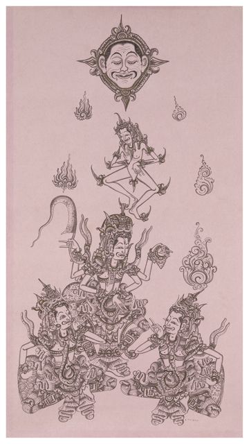 5. Brahma, Siwa, and Wisnu with Sanghyang Widi and Manubawa, Ketut Madra, Peliatan, Ink and acrylic on paper, 1973, 29 x 53.5 cm, Collection of David Irons